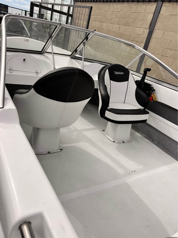 Parabrisas curvo, dirección con volante, 2 butacas giratorias, sillón en popa, tambucho en proa, bomba de achique, luces de navegación y más.